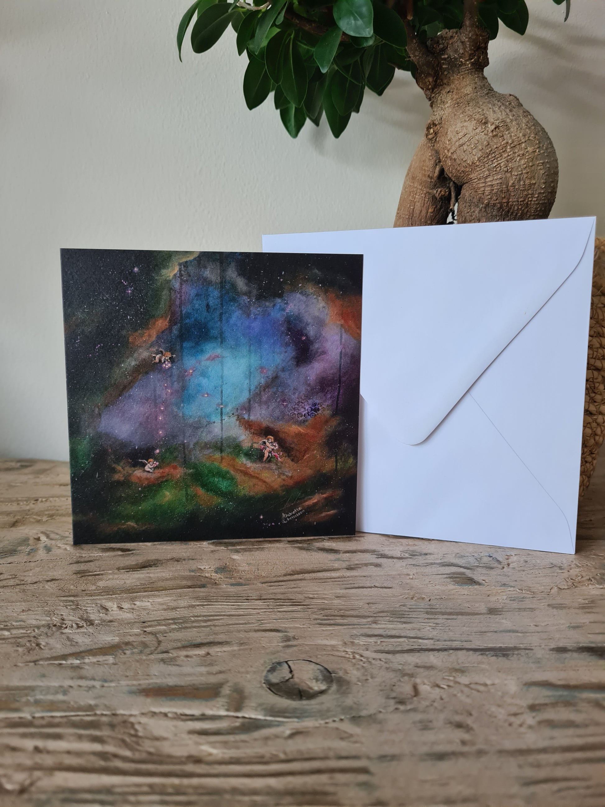 Embark on a celestial journey with the "Heavenly Wanderer" postcard. This 14 x 14 cm (5.5 x 5.5 inches) postcard, crafted on structured paper, beautifully showcases the serene beauty of the night sky. Ideal for framing or sending a message from the stars. Available globally with a white envelope (excluding frame).
